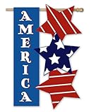 Spell out your patriotism with our America with Stars Sculpted Artistic Blends Garden Size Flag. Written on a deep blue background, the word "America" is in bold white letters to announce to everyone your spirit. Found alongside this are three alternating stars. These include two red with white stripes stars and one blue star with white stars on it. This Garden Size Flag will blow in the wind for the entire neighborhood to see. Display this America with Stars Flag in your garden or in the yard for all to see; making this is a wonderful addition to your landscape.