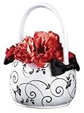 This white satin flower basket measures 7" tall and 5.125" wide. The body is silkscreened with a black floral scroll design that covers both front and back. Two black satin bows accent the ends of the handle. Also available in a Red & White version.