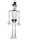 This cool metal and glass skeleton wind chime is great for Halloween or all year round! The skeleton's hat, bow-tie, shoulders, pelvis, hands and feet are made of metal, and his bones are made of pieces of thick, interconnected white glass that create a soothing tinkling sound when the wind knocks them into the metal pieces. The skeleton is 25 inches tall, 7 1/2 inches tall and the black metal hanger has a 3 inch chain. It makes a great gift for anyone with a love for the macabre.