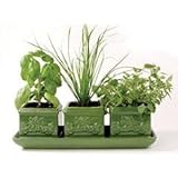 This beautiful trio of planters allows you to grow your own herbs right in the comfort of your own kitchen ! Just place the herb pellets into the 7" pots, fill with soil and place in a sunny spot. Looks great in a kitchen windowsill. Oregano, Chives and Sweet Basil are included in the Italian Herb Trio. The set contains three green glazed planters with a matching drip tray. Makes a great gift for those who love to cook with their own fresh herbs!