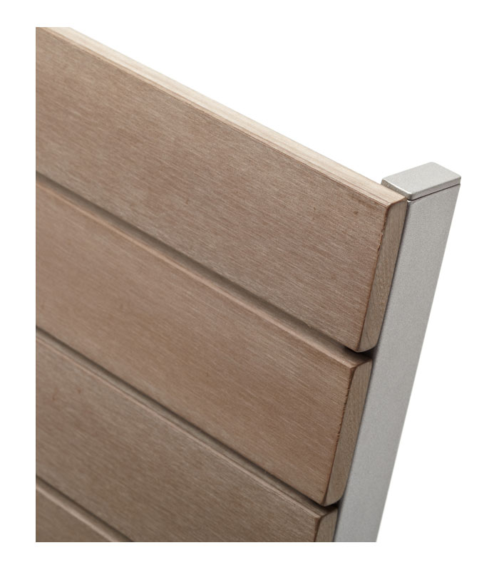 The eye-catching chairs feature a lightweight silver-colored aluminum frame (powder-coated for year-round rust resistance) and tightly spaced resin slats, natural colored for the look of real wood. The durable resin material is intended to stand up to the elements and last season after season.