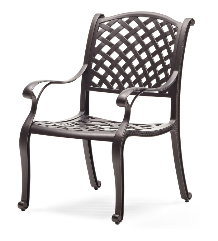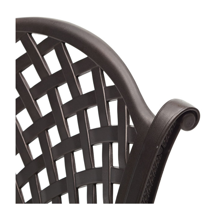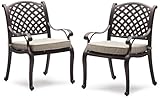 The elegantly classic arm chairs feature cast-aluminum construction with woven detail and a dark-brown powder-coated finish for enhanced durability and rust resistance. Two stone-colored cushions made of 100% polyester come included.