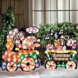 With its cheerful holiday design and 200 clear mini-lights, this Christmas Train Yard Art is sure to be the hit of the neighborhood.The lights of the Christmas Train Yard Art can be set to steady or motion, providing the illusion of wheels rolling, Santa waving, bell ringing, smoke blowing, and more. Messages on the two train cars flash from "Christmas Express" to "Happy Holidays". You can also use the built-in controller to set the speed of the changing lights. The Christmas Train Yard Art measures approximately 27"H by 7-1/2-ft. long (with engine and two cars spaced 2-ft. apart).