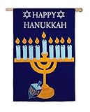 The menorah is lit, and the dreidel is ready for spinning. This is a flag of Hanukkah celebration. As it declares "Happy Hanukkah" between two stars of David, it celebrates the reason for the season with every wave in the wind. Share the joy of the holiday with friends and neighbors who stop by with this eye-catching flag in blue, gold, and white.