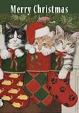 featuring three adorable kittens stuffed into colorful Christmas stockings. Created by Artist Bill Vanderdasson. Reads correctly from one side. Printed