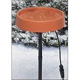 Comes complete with a metal stand 3 Stakes are provided to securely anchor to ground Thermostatically controlled 50W heated bath Heating element and all electrical parts may be removed after winter allowing the bath to be used all year 14 in. Dia. x 4.5 in. H (4.3 lbs.) When winter returns, simply snap the heating element back in place. The bath will remain ice-free under below-zero conditions.